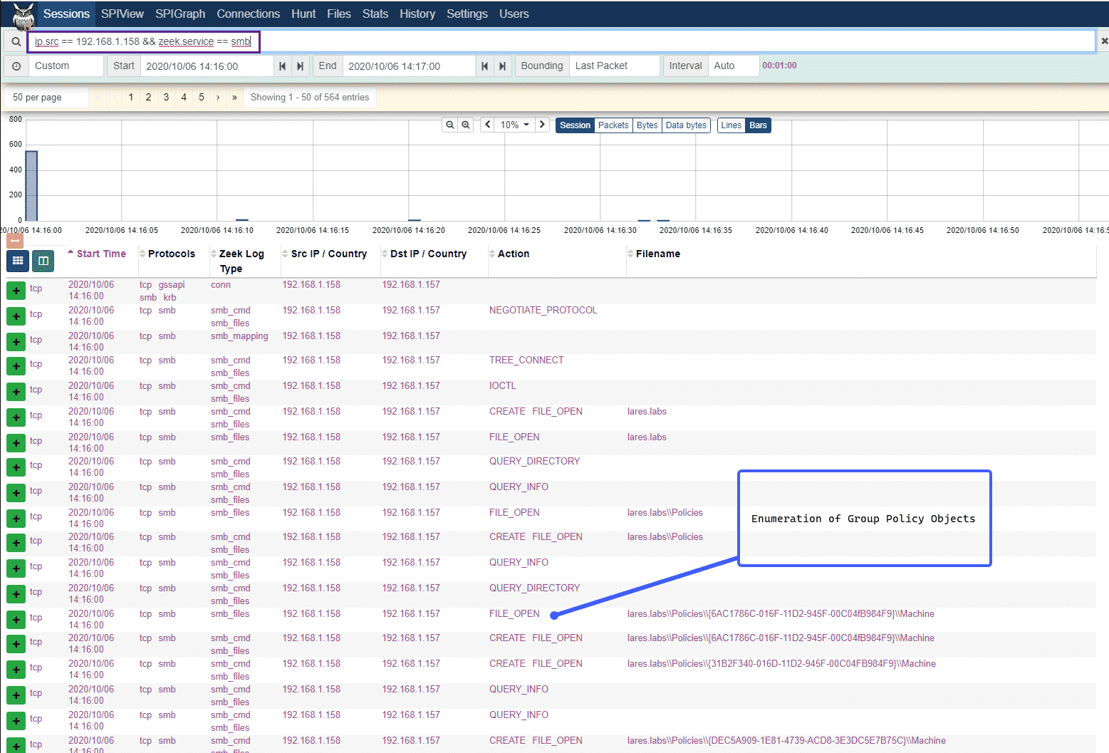 And then use the following query in Malcom to look at the SMB traffic originating from the host on which Grouper2 was running, in my case 192.168.1.158: