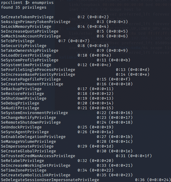 Now that we’ve looked at some LDAP, Kerberos, and SMB traffic, let’s take a look at what RPC enumeration looks like at the network layer. For this, I’ll be using rpcclient. After connecting to our domain, we run a simple enumprivs command to list the privileges that our account has: