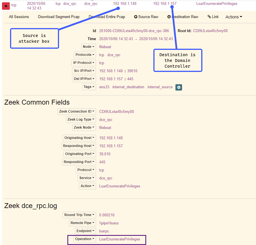 We can see from above that our source IP is our “attacker” machine and our destination IP is the Domain Controller. We can also see a call to the LsarEnumeratePrivileges RPC call, which corresponds to our enumprivs rpcclient command.