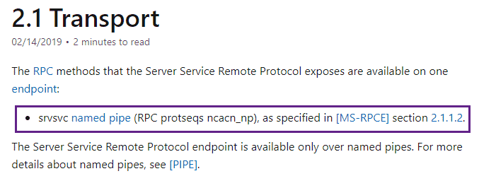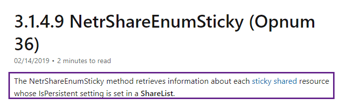 We can see above the call to the NetrShareEnumSticky RPC call, as well as a connection to the srvsvc pipe – we can, very gently, dip our toes into the Microsoft RPC documentation and here to get a better sense of what these do: