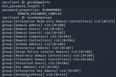 An interesting RPC call indeed and perhaps useful to baseline what hosts are enumerating network shares. Let’s execute two more rpcclient commands, getdompwinfo, and enumdomgroups to enumerate the groups on the domain as well as the domains password requirements: