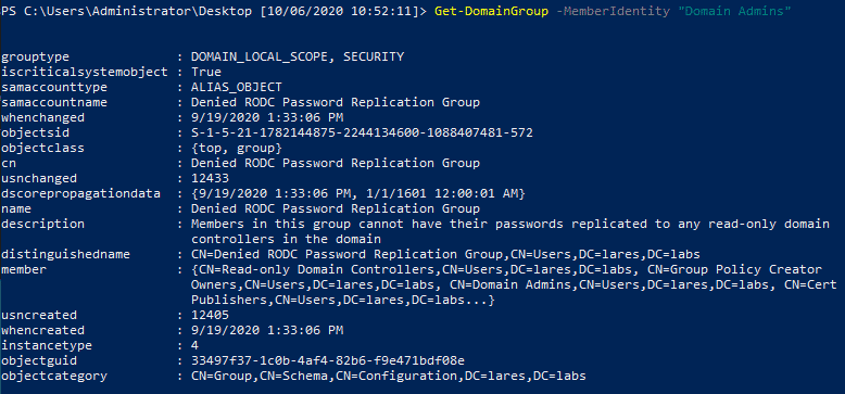 We run the command, looking at the Domain Admins group, and we can see the results returned to us: