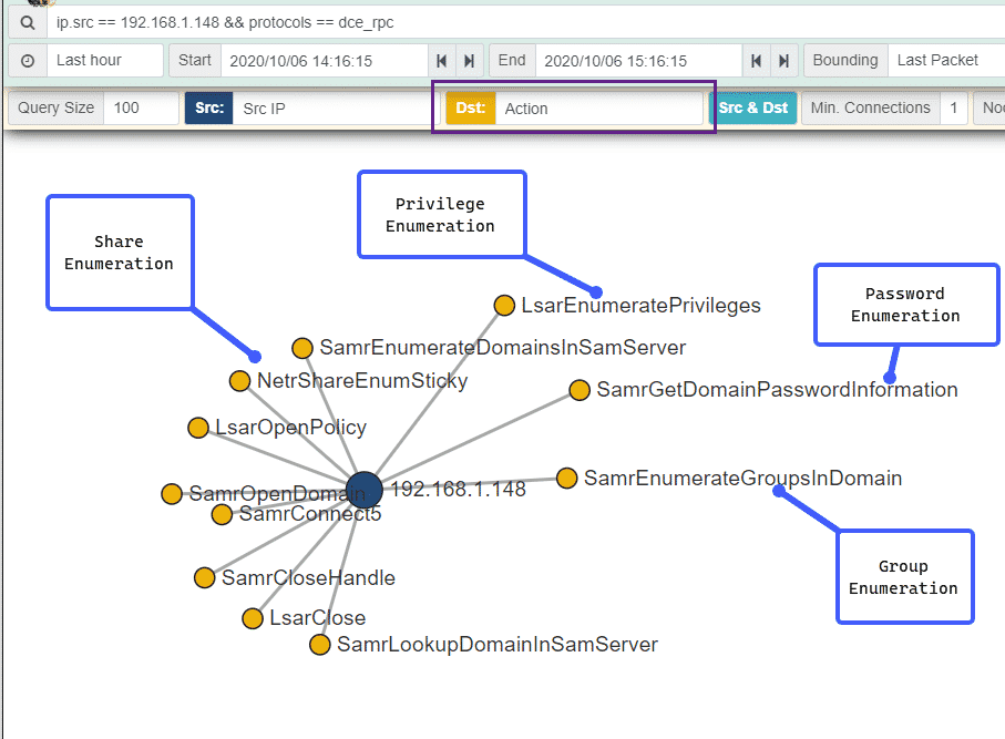 We can once again use Malcom’s / Moloch’s “Connections” view, changing the “Dst” to show the RPC Action to get a view of what RPC calls our “attacker” IP made: