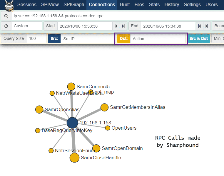 We can then use the Connections option in Moloch/Malcolm to get a birds-eye view of the RPC calls that were made by our SharpHound execution: