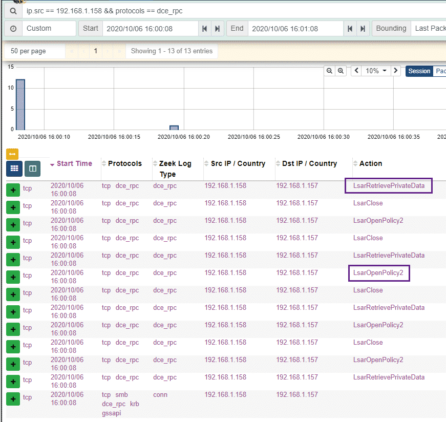 Here we can see the RPC calls used for share enumeration, privilege enumeration, password enumeration as well as group enumeration. Moloch and Malcolm’s powerful interface really shines here, presenting a flood of data in an easy and understandable chart.