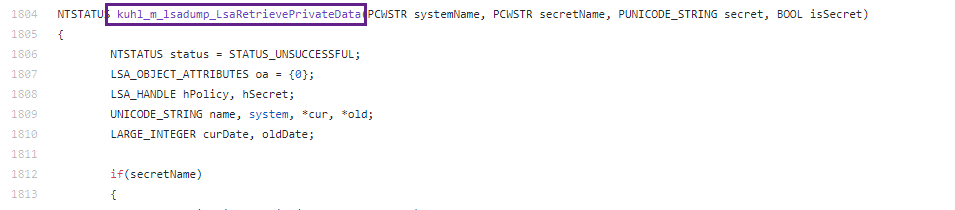 We can go ahead and search for these in the Mimikatz source code. We can see the code that uses LsarRetrievePrivateData: