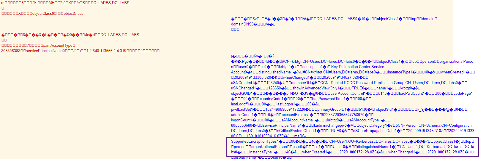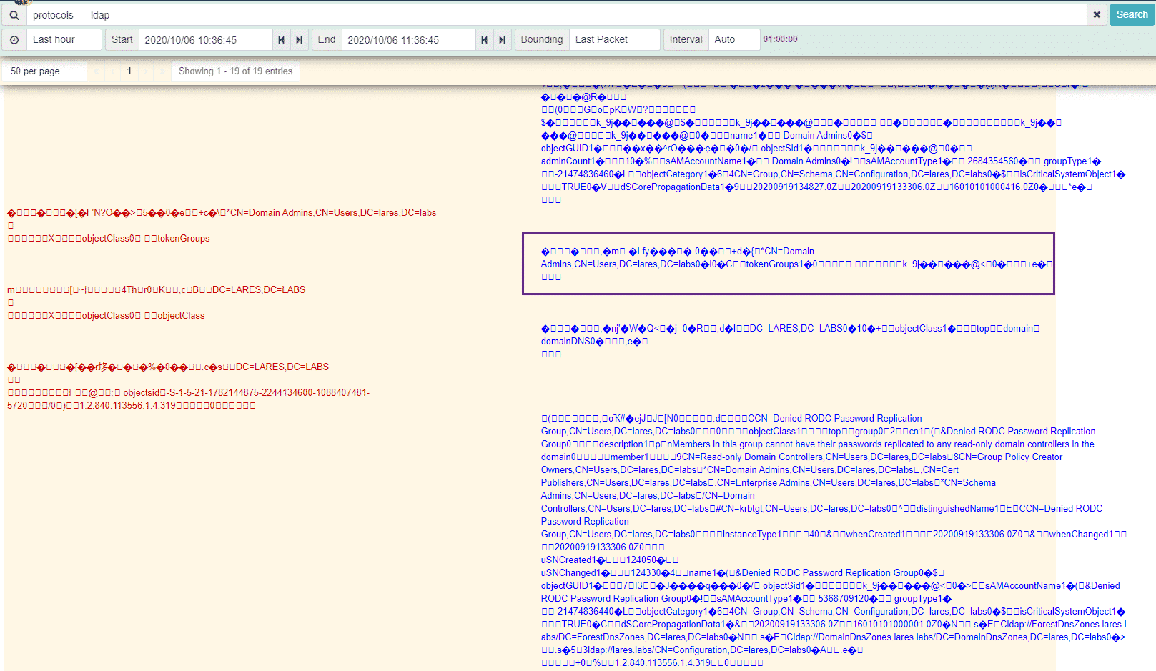 We can see the entire network ‘conversation’ happening, with the source traffic in red on the left and the destination traffic on the right in blue. We can see the LDAP query being sent over the wire as well as the results being returned from the Domain Controller.