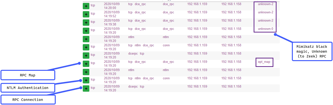 Once again, let’s take a look at the network traffic generated. This time we see a few RPC calls that Zeek was unable to parse which are labeled as “unknown” – in addition to this we can see the NTLM authentication occurring over RPC as well as a call to ept_map: