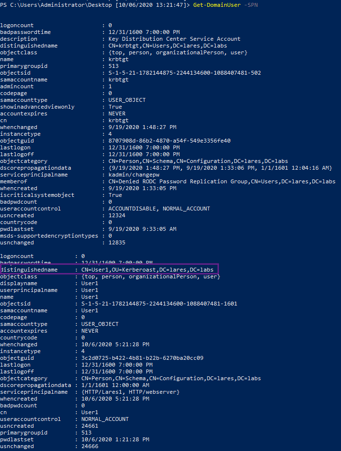 The Get-DomainUser -SPN command is self-explanatory and pulls user accounts with Service Principal Names set. In my case, I have a user named User1 that has an SPN set, and we can see these results returned back to us:
