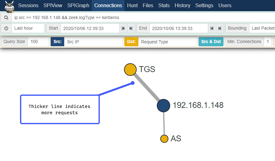 We can see above that the line representing Ticket-Granting Service (TGS) ticket requests is thicker than the Authentication Server (AS) request, this is because the IP address 192.168.1.1.148, which is our attacking machine, requested more than one TGS, but only one AS.