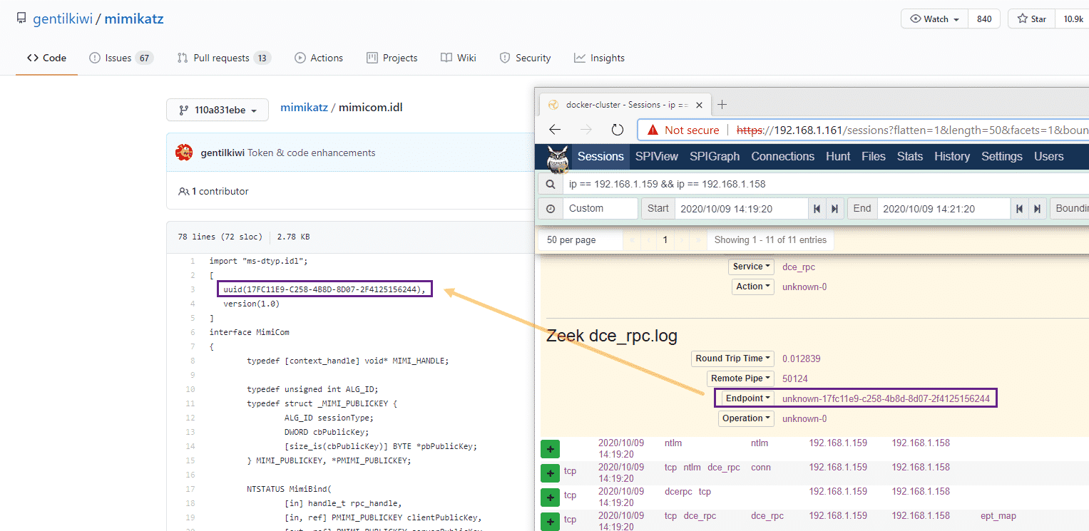 Let’s dig into the unknown RPC calls a bit, if we open up the session information in the Moloch/Malcolm interface, we can see a GUID/UUID value. A quick search through the Mimikatz source code reveals that this UUID is used in the mimicom.idl which is used by Mimikatz for the RPC server/client functionality.