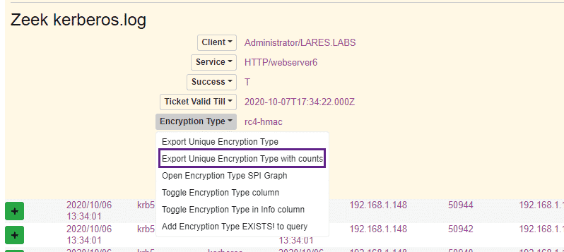 We see above that the line for rc4-hmac is thicker – this also confirms that a downgrade attack occurred, as the requested tickets were returned in RC4 rather than AES format. We can flex the power of the Moloch / Malcolm user interface by clicking on the Encryption Type field within the Moloch logs and choosing the “Export Unique Encryption Type with counts” option: