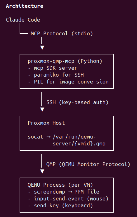 Some QMP MCP tools existed, but none that would exactly what I needed, so Claude and I built a new one with architecture that looks like: