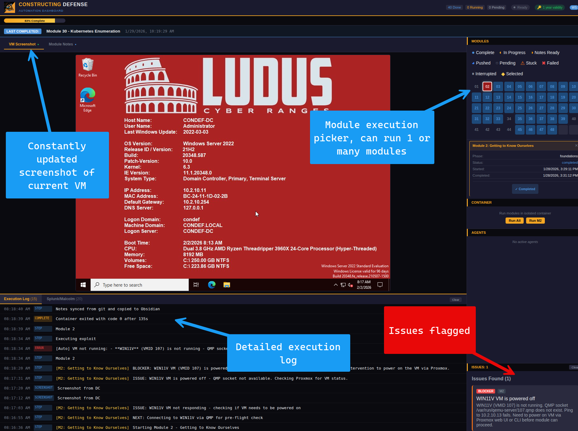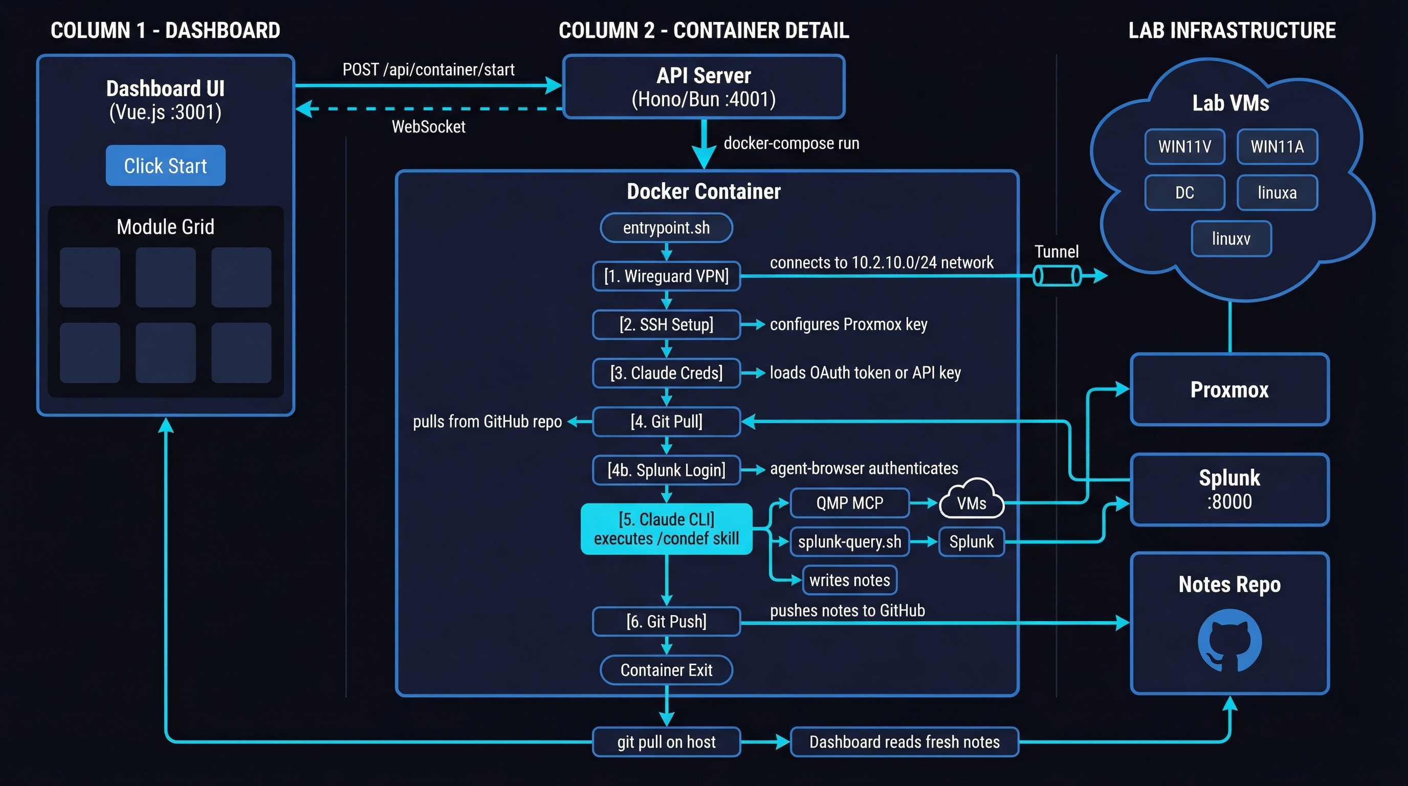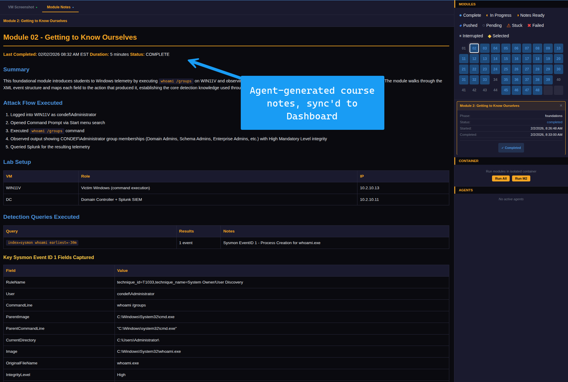 When I pick and execute a module from the Dashboard, the container is started and uses Wireguard to connect to the Proxmox network where the Constructing Defense VMs live. It then sets up SSH to connect to the Proxmox host, as well as the Claude OAuth token so that the Claude session doesn’t expire as the agent is going through the course.