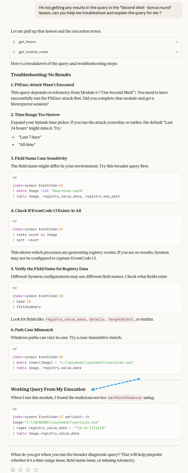 What’s cool about this is that the troubleshooting steps are unique and scoped to Constructing Defense, minimizing token usage & hallucinations for those using the MCP. In other words, the agent relies on it’s own troubleshooting notes, generated by actually performing the modules in the course.